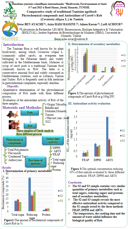 The 2nd International Scientific Days took place from May 5th to 7th, 2023 in Monastir, Tunisia. The GourMed project had a presence at the event, showcasing a poster presentation titled "Comparative study of traditional Tunisian agrifood: Phytochemical compounds and Antioxidant of Carob's Rob (Ceratonia siliqua L.) in Tunisia." Dr. Siwar Ben Ayache presented the poster during the event, offering the scientific community who attended valuable information about GourMed.