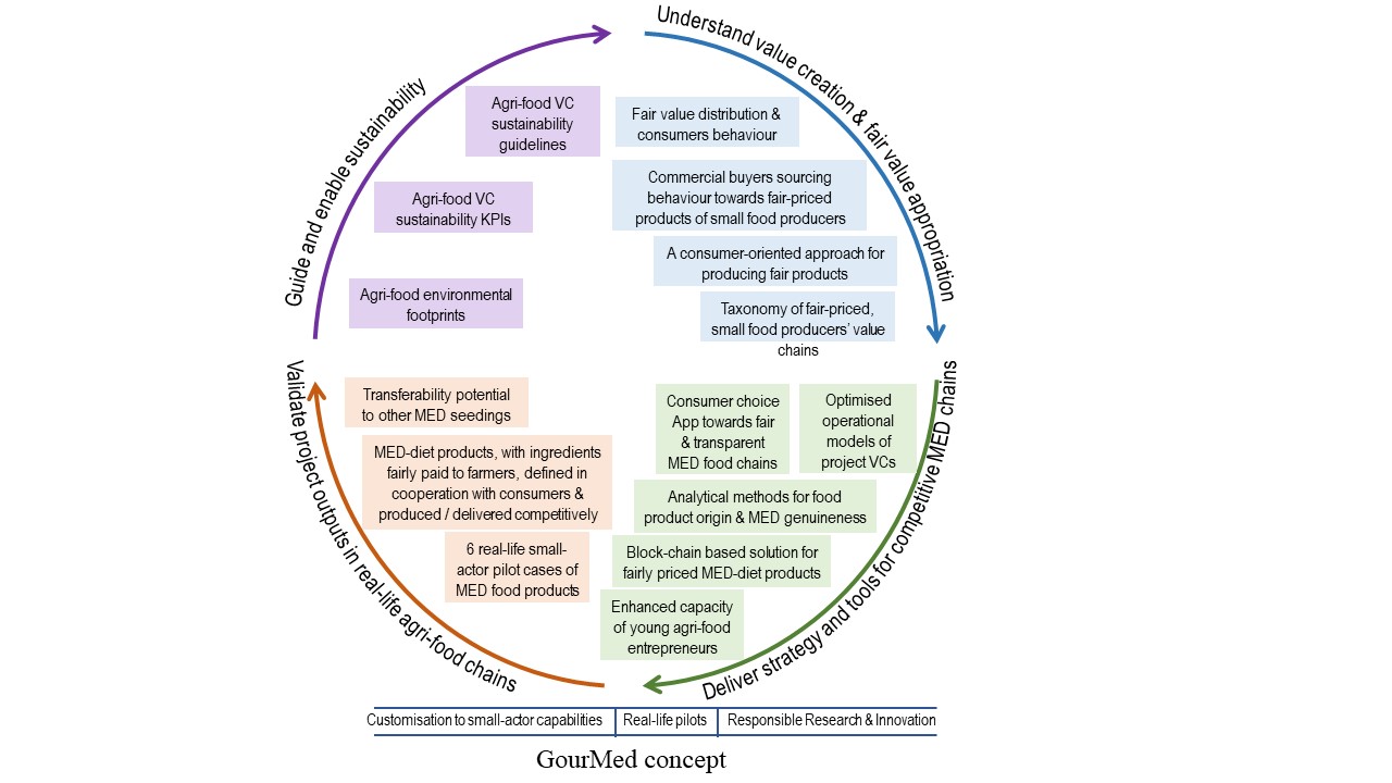 The Consortium consists of organisations and VC actors from 6 countries, including 3 Research Centres, 3 Universities, with the support of 6 SMEs (clustering a large number of small farmers), bringing altogether complementary knowledge (i.e. supply chain, R&D, food systems) with a demonstrated track record of success and consistent relationships with national and international stakeholders. Most partners already collaborated in previous EU and National projects. The GourMed team will work collaboratively following a conceptual approach structured around five pillars and three horizontal facilitators.